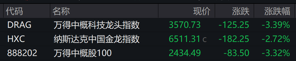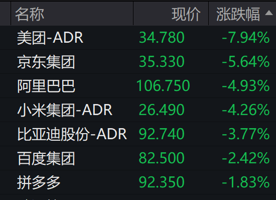 中概股也集体下跌,纳斯达克中国金龙指数收跌2.72%。美团跌近8%,京东集团跌超5%,阿里巴巴、小米集团均跌超4%。