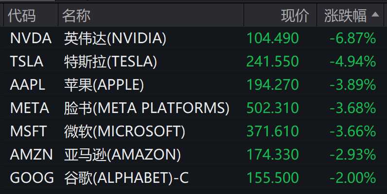 芯片股重挫。英伟达跌近7%,AMD跌超7%,费城半导体指数下跌4.1%。