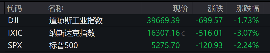 三大指数大幅收跌。纳指跌超500点,跌幅为3.07%;道指跌近700点,跌幅为1.73%;标普500指数跌2.24%。